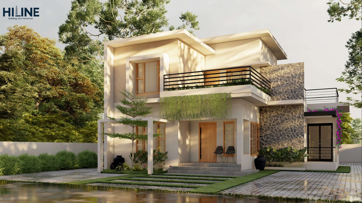 A beautiful modern contemporary home featuring a striking balance of smooth white geometric facade framing and rough natural stone cladding. Set amidst tall trees, the residence boasts a warm wooden front door, an expansive upper-level balcony with sleek black railings, and lush draped greenery that softens the strong architectural lines.